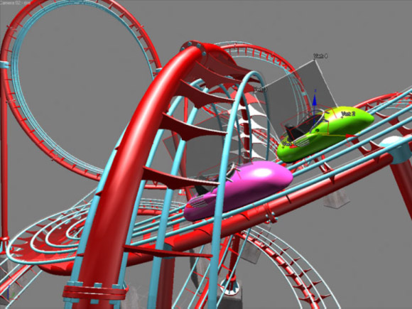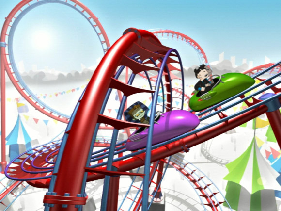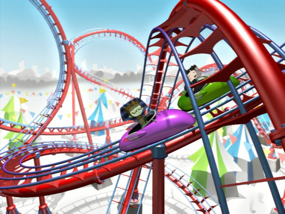 After working through various ideas, we submitted a roller-coaster storyboard, where opposing characters would race each other through the twists and turns of a roller-coaster track. We would build and animate the track and shots in 3D, but would composite the characters in, in post production using techniques I would pioneer over the course of the project.